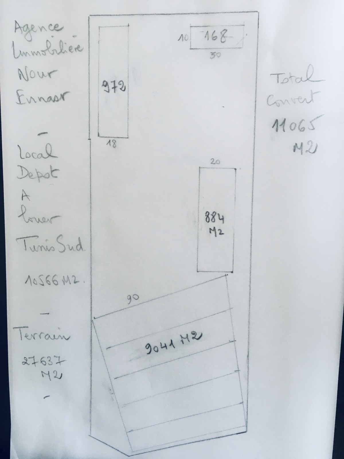 L’Agence immobilière Nour Ennasr met en location un local dépôt de surface totale 11065 m2 répartie sur trois parties comme indiqué au plan d’ensemble du local , Seule la partie de 972 M2 est a revoir pour la hauteur et le toit . les locaux principaux de 9041 M2 et 884 M2 sont en parfait état : hauteur 6 M des cotés et 8,5 M au pic , sol Industriel Lisse , accès multiples de manière à ce qu’il s’apprêtent aussi bien au stockage et logistique qu’à l’activité industrielle . les espaces couverts sont extensibles du fait que les bâtiments actuels sont cadrés dans un coté du terrain offrant un vaste espace libre de l’autre côté a exploiter . Le local est clôturé indépendant et facilement accessible et liée aux voies rapides et autoroute vers le port commercial de Rades , la capitale et le sahel et le sud .