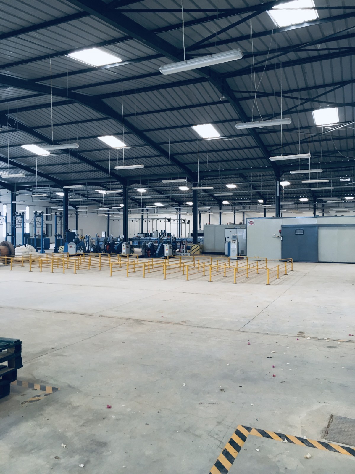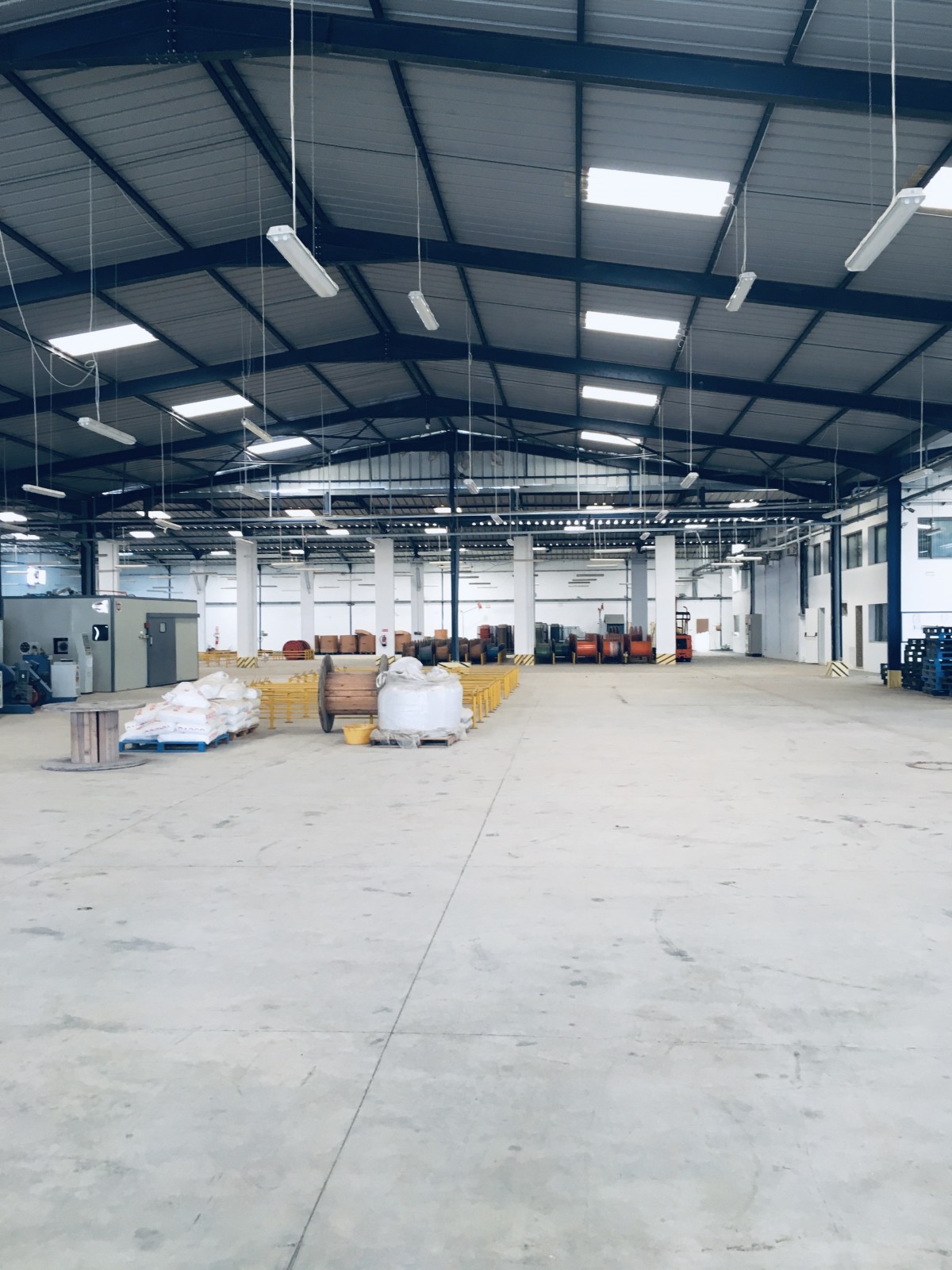 56,3 X 36 M et 45.8 x 28,8 M et de 46 X 37 M toit en charpente haut de 6 et 8 M sol industriel lisse, L’espace administration fait 360 M2. L’entrée camion est arboré dans ses côtés et mène vers le quai. La puissance électrique est de 630 KVA partagée. Le bloc administratif dispose d’une entrée vitrée avec jardin arboré et vert. Les bureaux sont meublés ainsi que les salles de réunion et d’attente.la distribution électrique, éclairage, force et prises sont en parfait état.